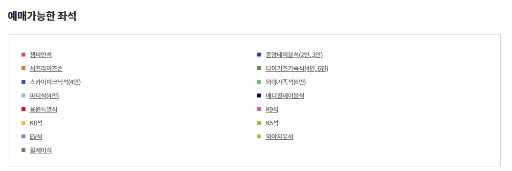 | 좌석 종류 | 일반석, 응원석, 테이블석 등 |